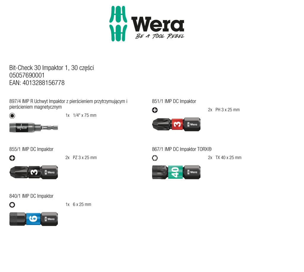 Bity udarowe do wkrętarki diamentowe z uchwytem IMPAKTOR Bit-Check Wera 05057690001