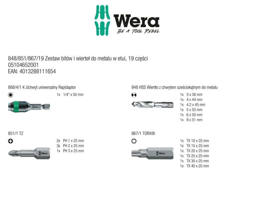 Bity i wiertła zestaw 19 części do metalu + uchwyt Rapidaptor w etui WERA 05104652001