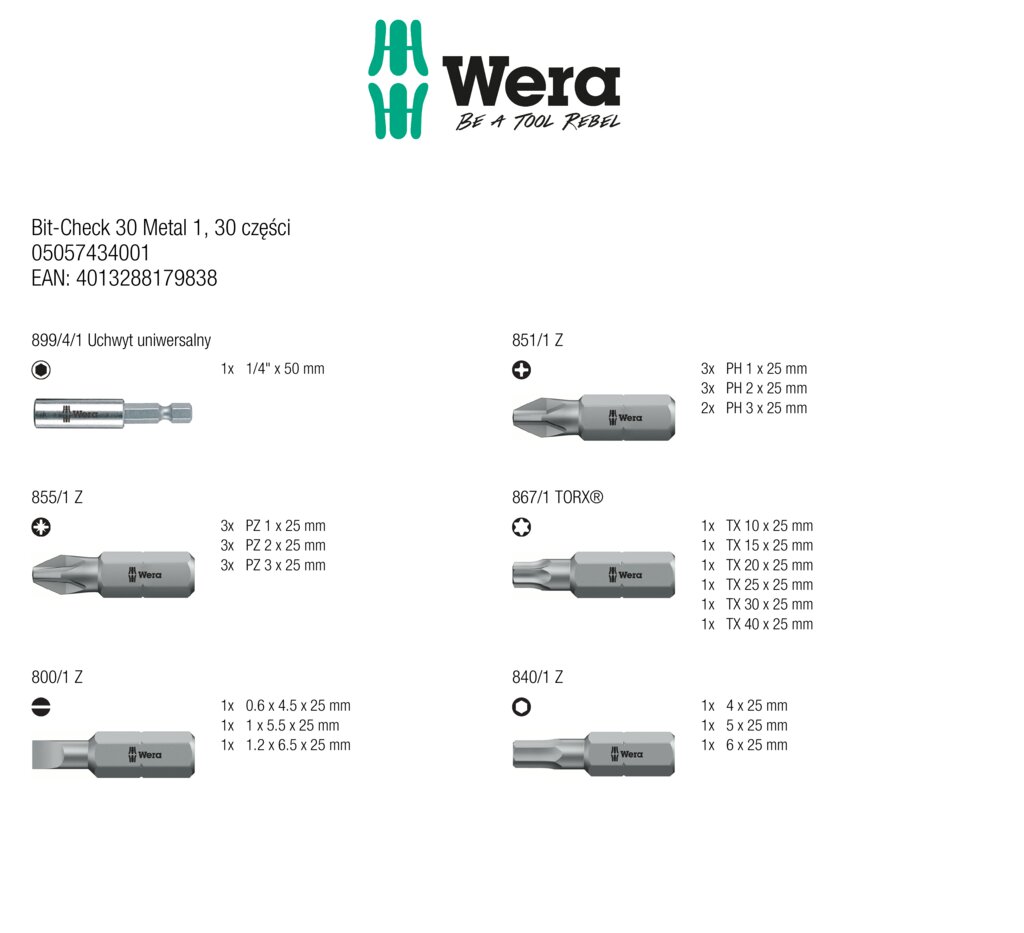 Bity w zestawie PŁ, TX, PH, PZ, HEX, WERA 05057434001