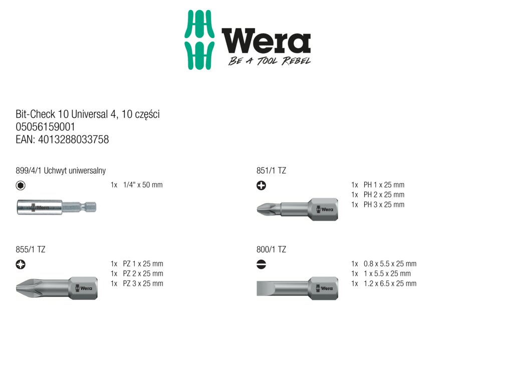 Bity zestaw 9 sztuk (Płaskie+PH+PZ) Bit-Check z mechanizmem szybkomocującym WERA 05056159001