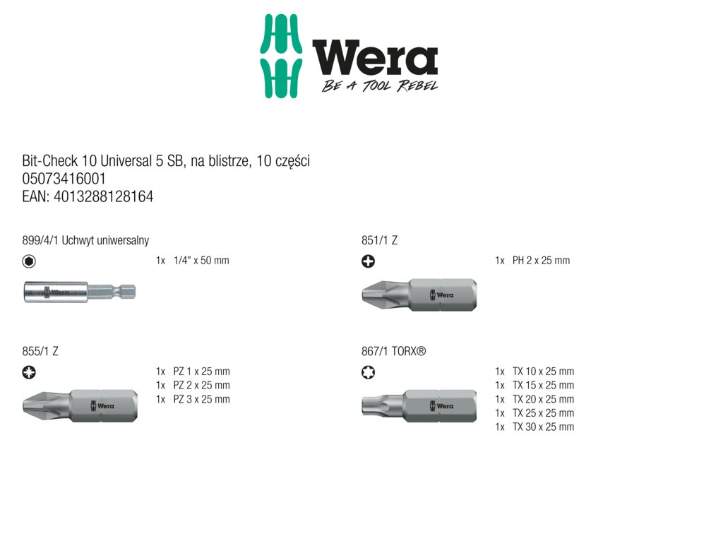 Bity zestaw Bit-Check 10 Universal 5 SB, na blistrze WERA 05073416001
