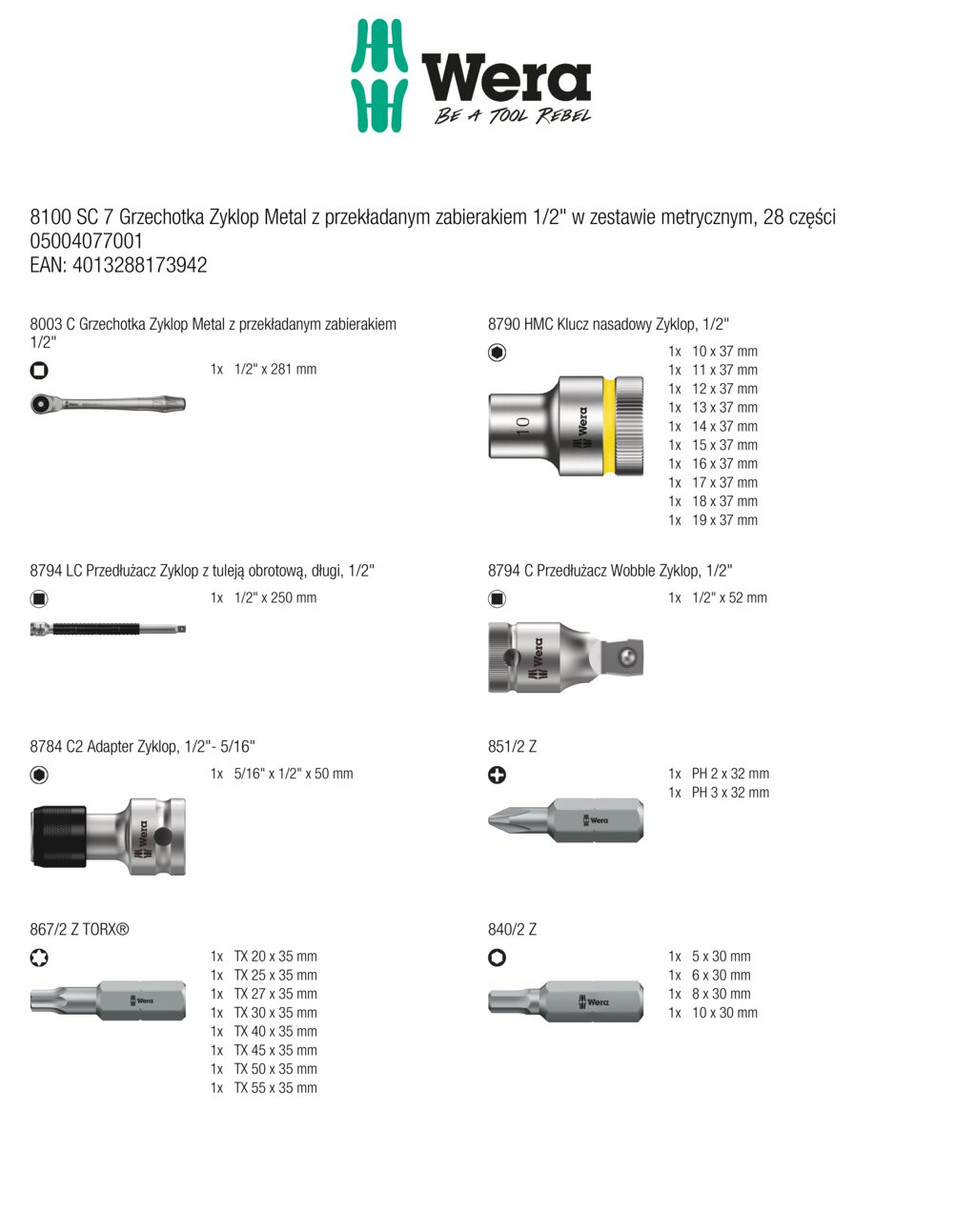 8100 SC 7 Grzechotka Zyklop Metal z przekładanym zabierakiem 1/2" w zestawie metrycznym, 28 części