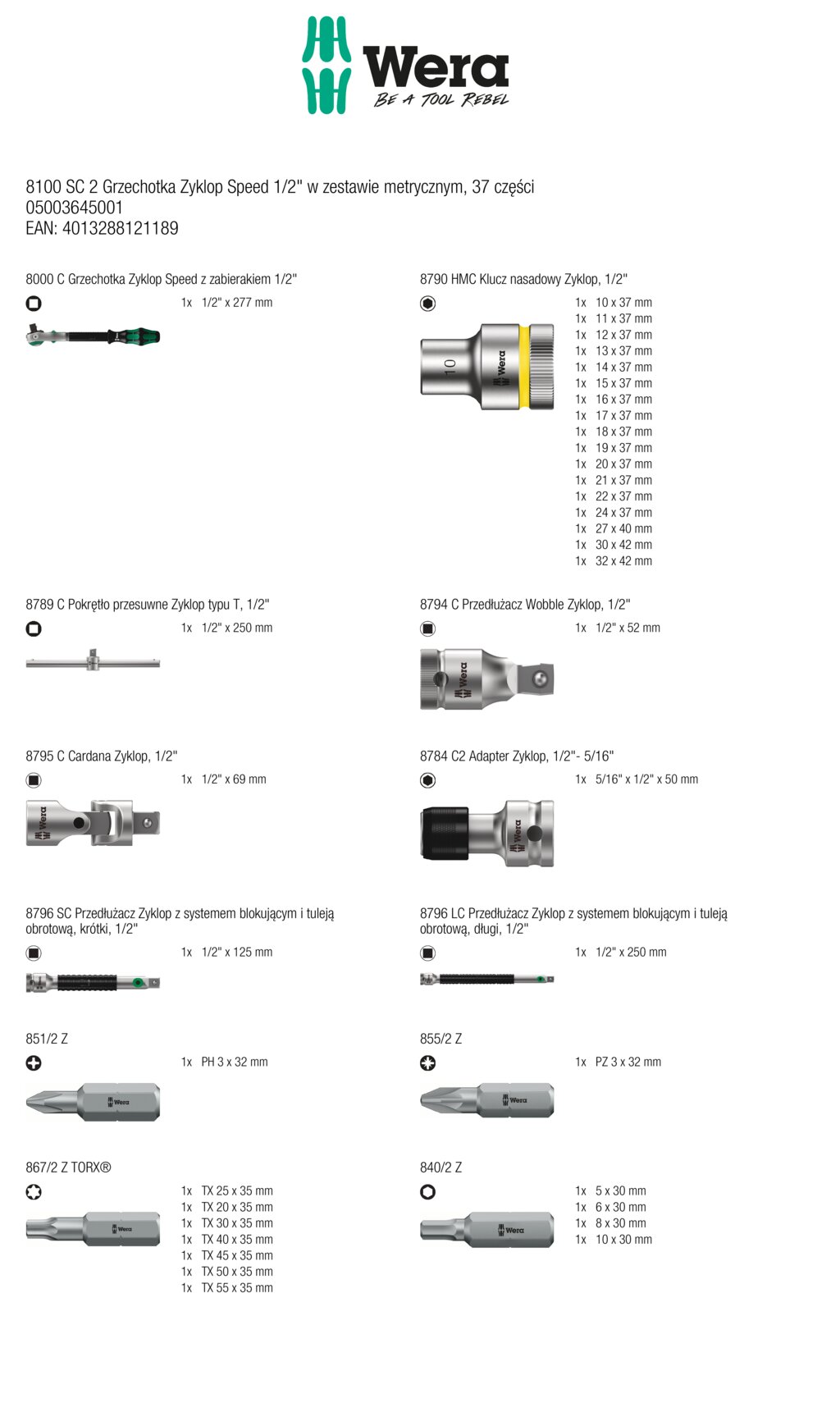 Klucze nasadowe 10-32 mm 1/2" zestaw 37 częściowy z grzechotką "Zyklop" 8100 SC 2 WERA 05003645001