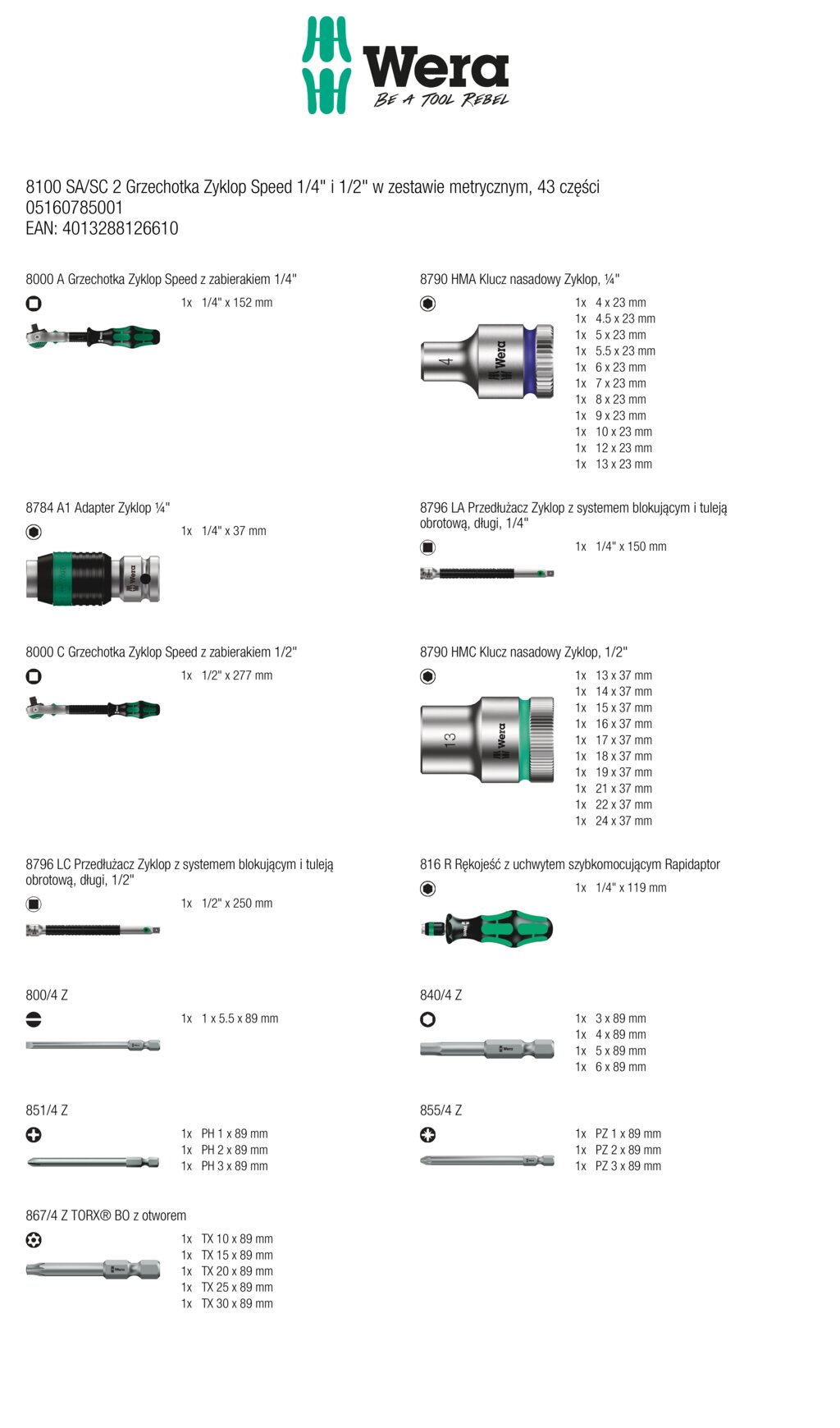 - 43-częściowy zestaw Zyklop w solidnej metalowej kasecie: 1 grzechotka Zyklop z zabierakiem 1/4", 1 grzechotka Zyklop z zabierakiem 1/2".