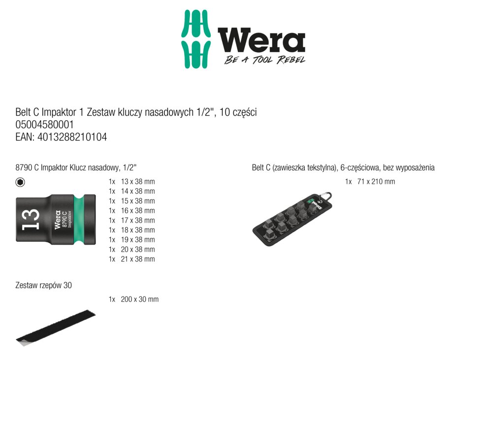 - Wytrzymała zawieszka tekstylna wykonana w stylu charakterystycznym dla firmy Wera z 9 końcówkami wymiennymi klucza nasadowego Impaktor do pracy w ograniczonych przestrzeniach.
