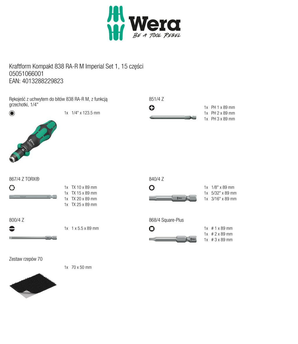 Wkrętaki Kraftform Kompakt 838 RA-R M IMP 15 części WERA 05051066001