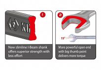 - Wzmocniona konstrukcja otwartego klucza pod kątem 15° o smukłym profilu.