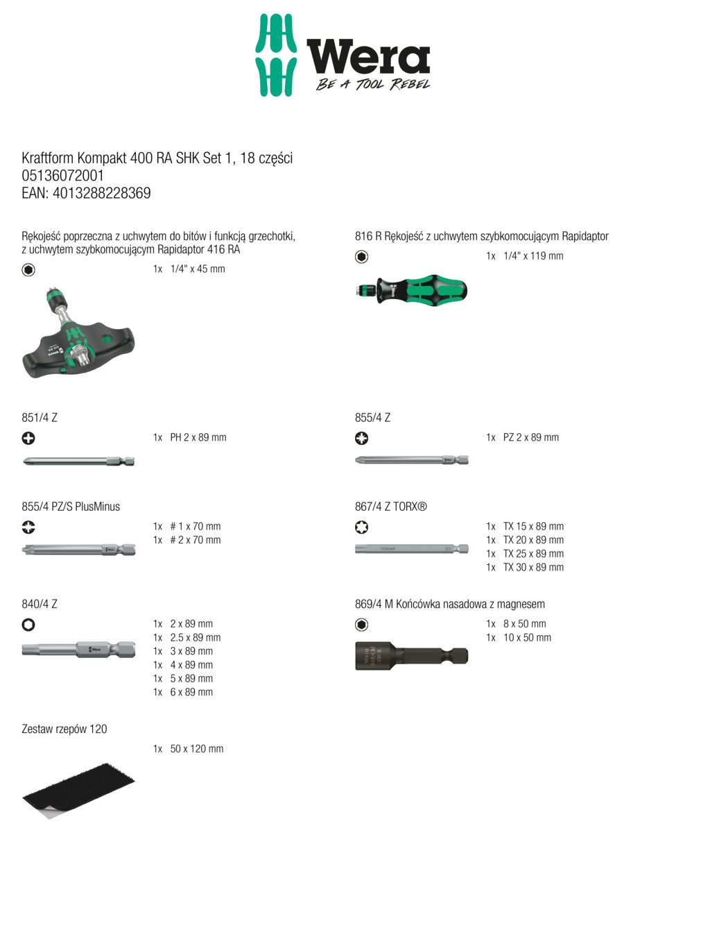 Rękojeść poprzeczna z uchwytem do bitów i funkcją grzechotki, zKraftform Kompakt 400 RA SHK Set 1 WERA 05136072001