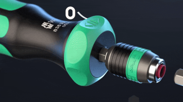 - Rękojeść z uchwytem na bity sześciokątne 1/4" wg DIN ISO 1173-C 6.3 i E 6.3 oraz serii Wera 1 i 4