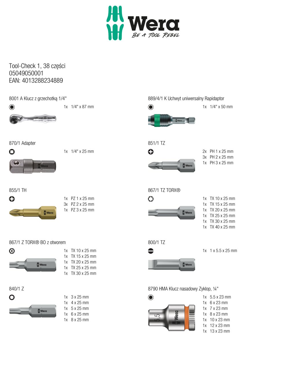 Zestaw zawiera 38 narzędzi w zajmującym niewiele miejsca etui. Tool-Check jest wykonany z wysokiej jakości tworzywa sztucznego i umożliwia przejrzyste przechowywanie, szybki dostęp do niezbędnych narzędzi i transport bez ryzyka zgubienia.