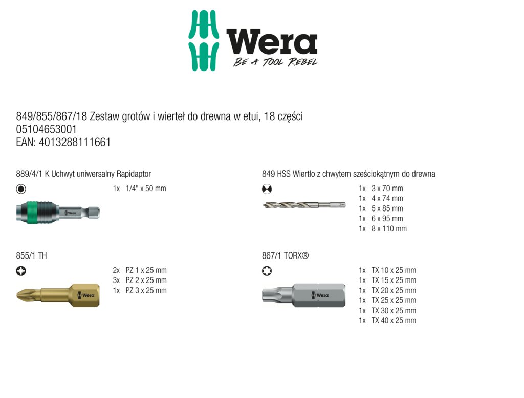 Wiertła szlifowane do drewna + bity i uchwyt Rapidaptor zestaw 18 sztuk w etui 849/855/867/18 WERA 05104653001