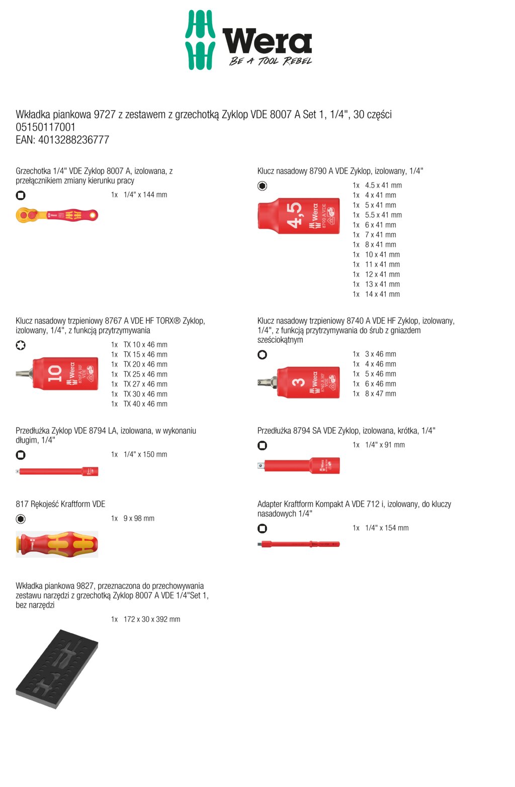 Wkładka piankowa 9727 z zestawem z grzechotką Zyklop VDE 8007 A Set 1, 1/4", 30 części WERA 05150117001