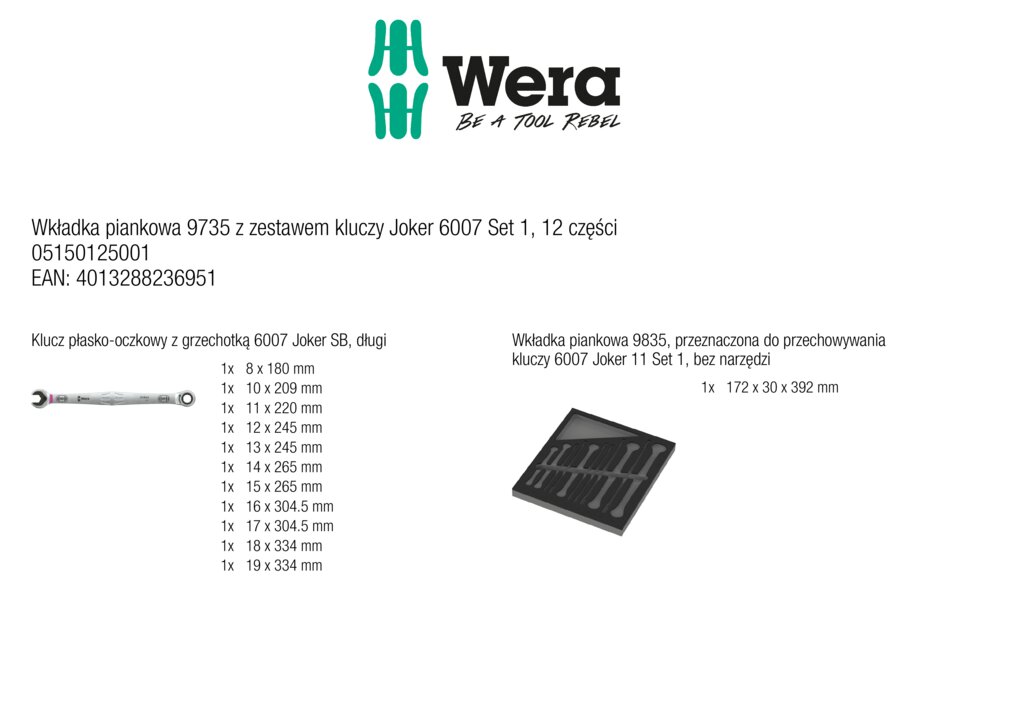 Wkładka piankowa 9735 z zestawem kluczy Joker 6007 Set 1, 12 części WERA 05150125001