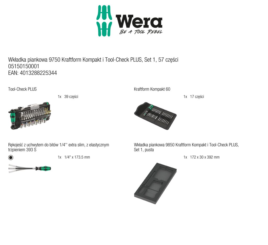 Wkładka piankowa Kraftform Kompakt i Tool-Check PLUS, Set 1, 57 część 9750 WERA 05150150001