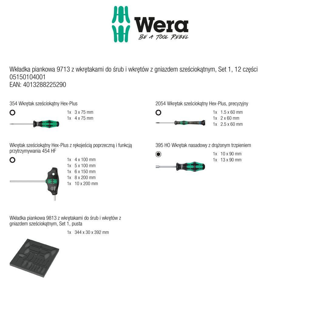 Wkładka piankowa z wkrętakami śrubokrętami do śrub i wkrętów z gniazdem sześciokątnym, Set 1, 12 części WERA 05150104001