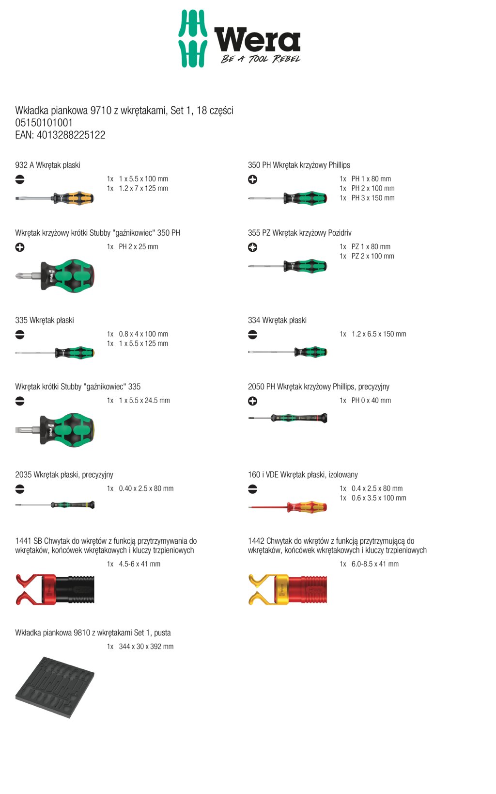 Wkładka piankowa z wkrętakami śrubokrętami , Set 1, 18 część 9710 WERA 05150101001