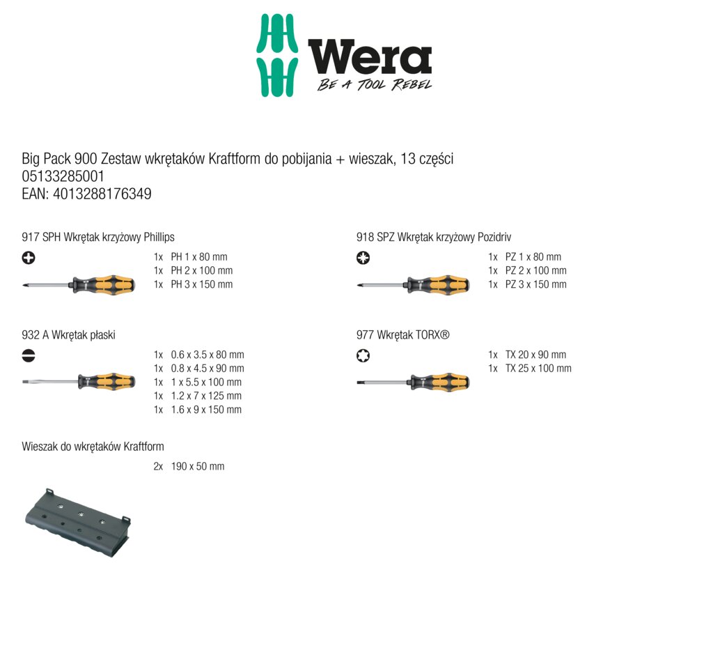 Big Pack 900 Zestaw wkrętaków Kraftform do pobijania + wieszak, 13 części 3x 917 SPH Wkrętak krzyżowy Phillips: PH 1x80 mm, PH 2x100 mm, PH 3x150 mm 3x 918 SPZ Wkrętak krzyżowy Pozidriv: PZ 1x80 mm, PZ 2x100 mm, PZ 3x150 mm 5x 932 A Wkrętak płaski: 0.6x3.5x80 mm, 0.8x4.5x90 mm, 1x5.5x100 mm, 1.2x7x125 mm, 1.6x9x150 mm 2x 977 Wkrętak TORX®: TX 20x90 mm, TX 25x100 mm 2x Wieszak do wkrętaków Kraftform: 190 x 50 mm