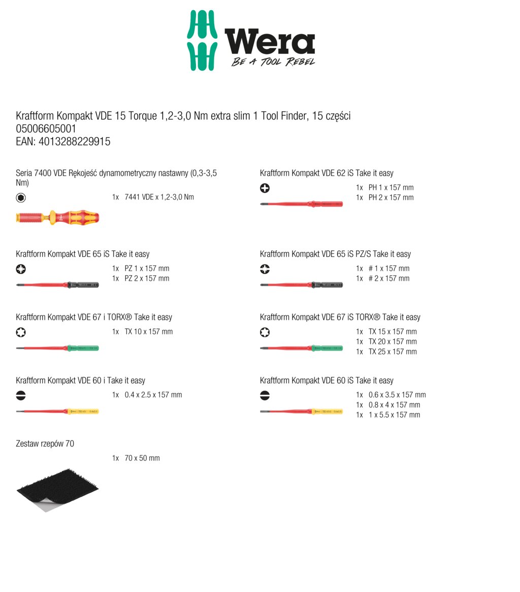 wymiennych izolowanych trzpieni Wera - 15-częściowy zestaw wymiennych trzpieni VDE z rękojeścią dynamometryczną nastawną.