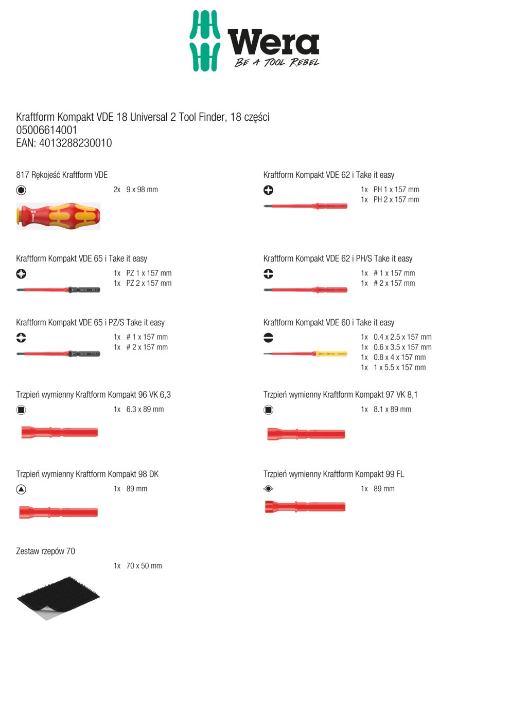 2 rękojeści Kraftform 817 VDE do wymiennych izolowanych trzpieni Wera - 16 wymiennych trzpieni izolowanych VDE z 2 rękojeściami Kraftform 817 VDE w wytrzymałym etui do mocowania na pasku.