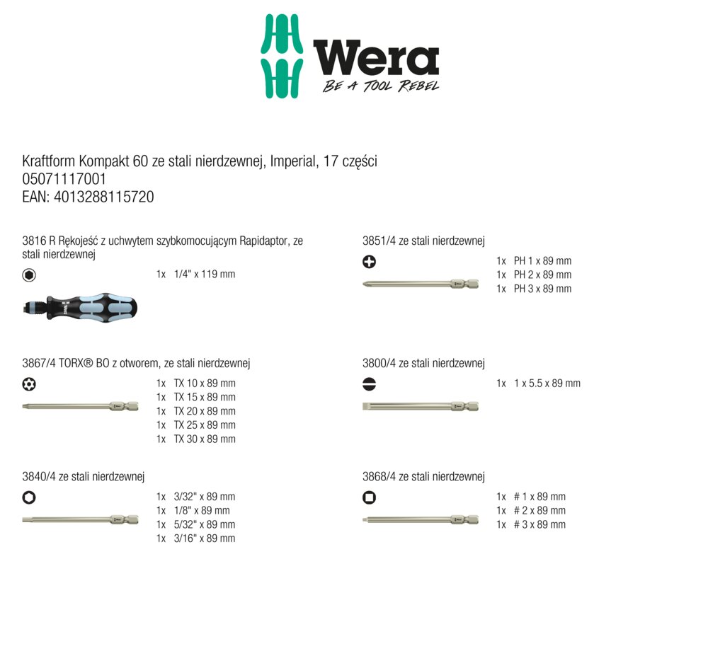 Wkrętaki śrubokręty Kraftform Kompakt 60 ze stali nierdzewnej, Imperial WERA 05071117001