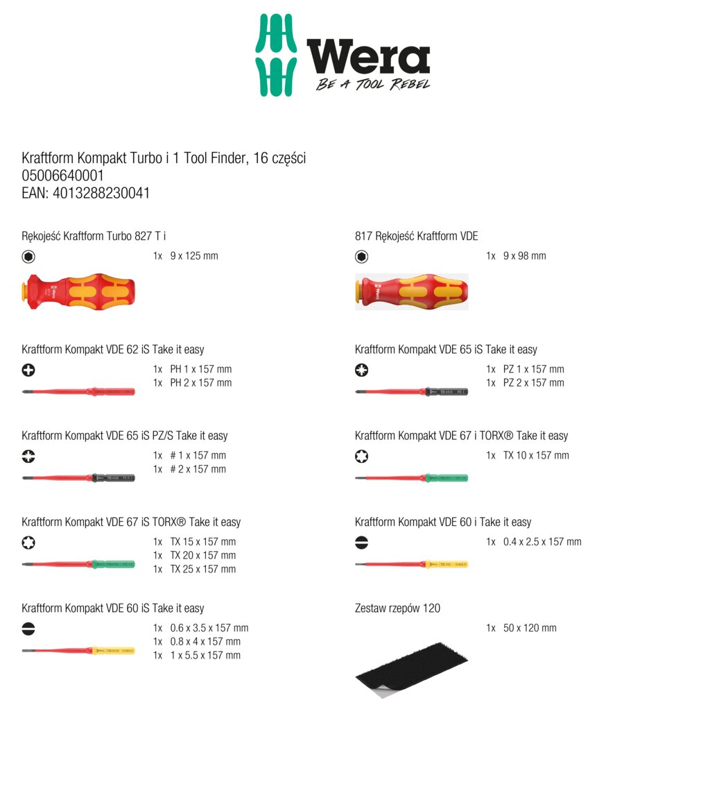 - W wersji VDE Rękojeść Kraftform Turbo 827 T i z wymiennymi trzpieniami Wera VDE, z indywidualnie kontrolowaną izolacją gwarantuje szybką i bezpieczną pracę nawet pod napięciem.