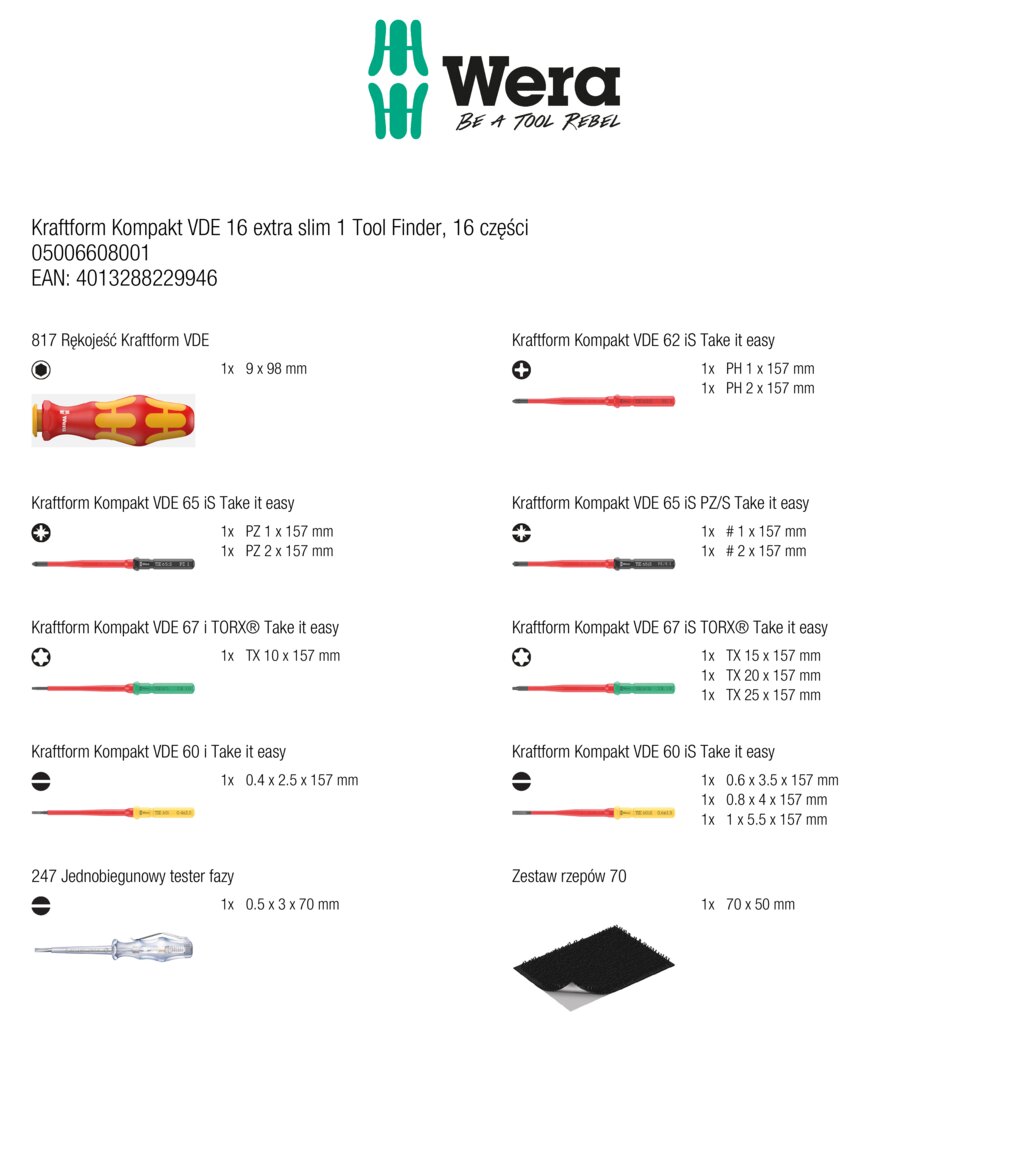 Wkrętaki śrubokręty Izolowane VDE 14 końcówek PH, PZ, PZS, TX, PŁASKIE Zestaw Kraftform Kompakt VDE 16 extra slim 1 WERA 05006608001