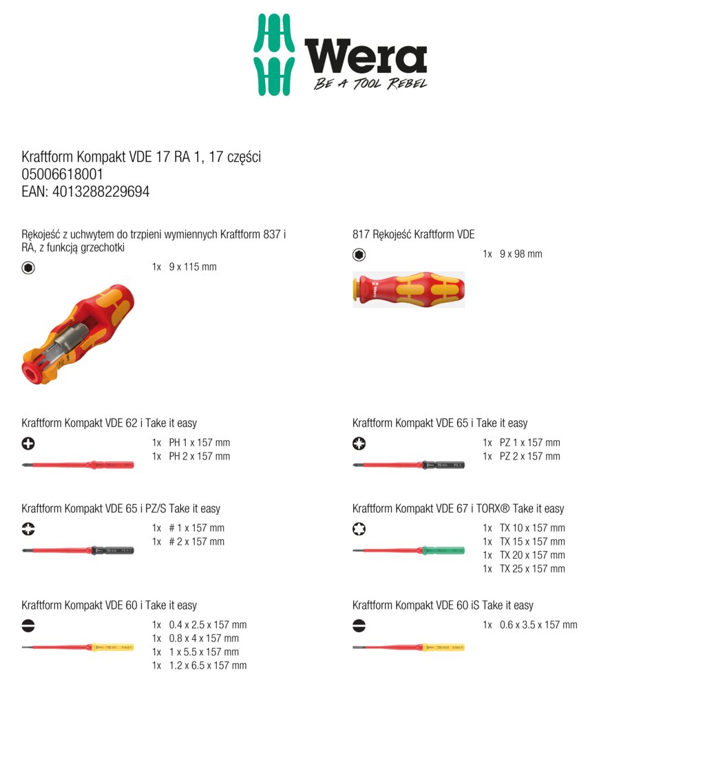 Wkrętaki Śrubokręty Izolowane Wymienne Końcówki Kraftform Kompakt VDE 17 RA 1, 17 części WERA 05006618001