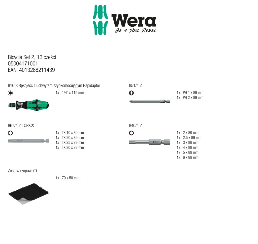 - 1 rękojeść Kraftform 816 R z uchwytem szybkomocującym Rapidaptor; do sześciokątnych grotów 1/4" wg DIN ISO 1173-C 6,3 oraz końcówek E 6,3, a także grotów i końcówek z serii Wera 1 i 4;