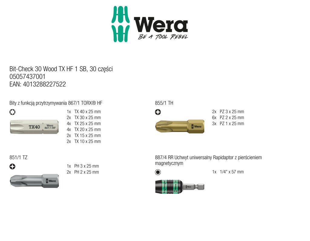 Zestaw bitów Bit-Check 30 Wood TORX HF 1 WERA 05057437001