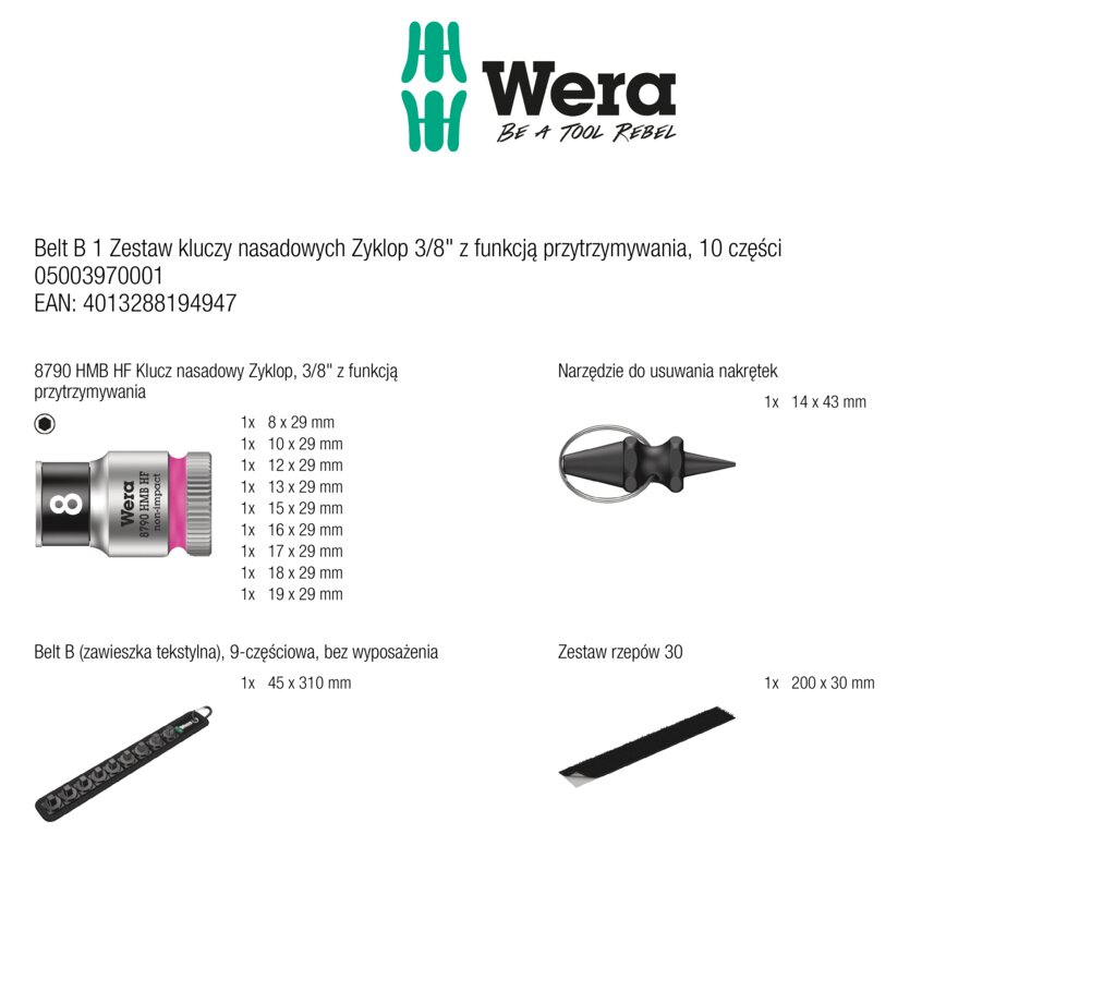 - Wysokiej jakości i odporna na zużycie tekstylna zawieszka wykonana w oryginalnym stylu który charakteryzującym firmę Wera z 10 bitami nasadowymi i narzędziem do usuwania nakrętek do pracy w ograniczonych przestrzeniach.
