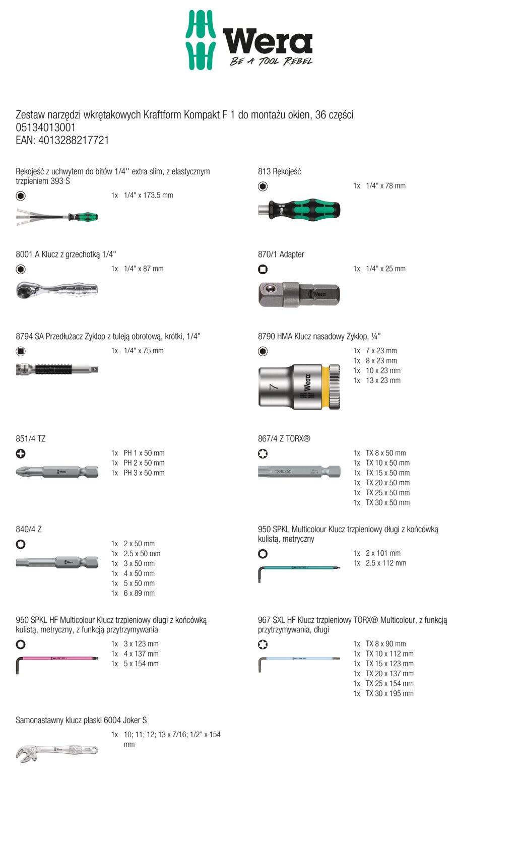 Kompaktowy zestaw 35 najważniejszych narzędzi wkrętakowych dla profesjonalistów zajmujących się montażem okien. Asortyment kluczy nasadowych i bitów wysokiej jakości firmy Wera dostosowanych do uniwersalnych zastosowań w montażu okien. 2 rękojeści z uchwytem na bity i grzechotka do bitów, która może być używana również do kluczy nasadowych.