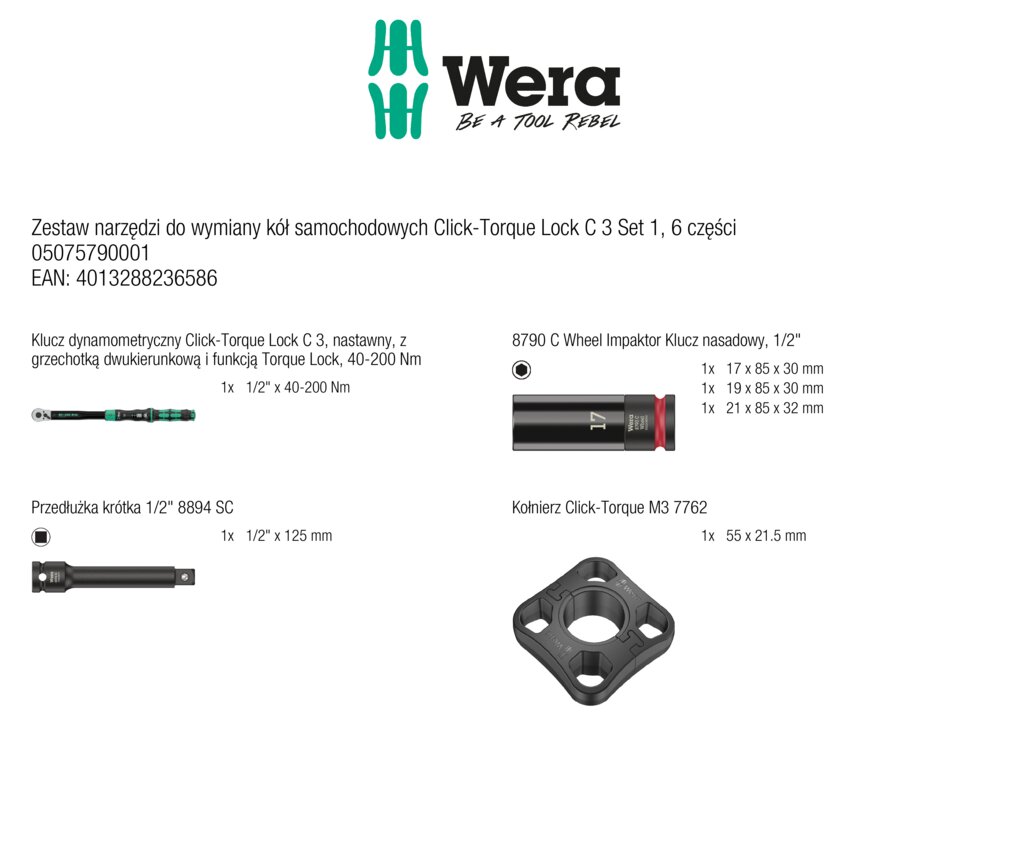 Zestaw narzędzi do wymiany kół samochodowych Click-Torque Lock C 3 Set 1, 6 części WERA 05075790001