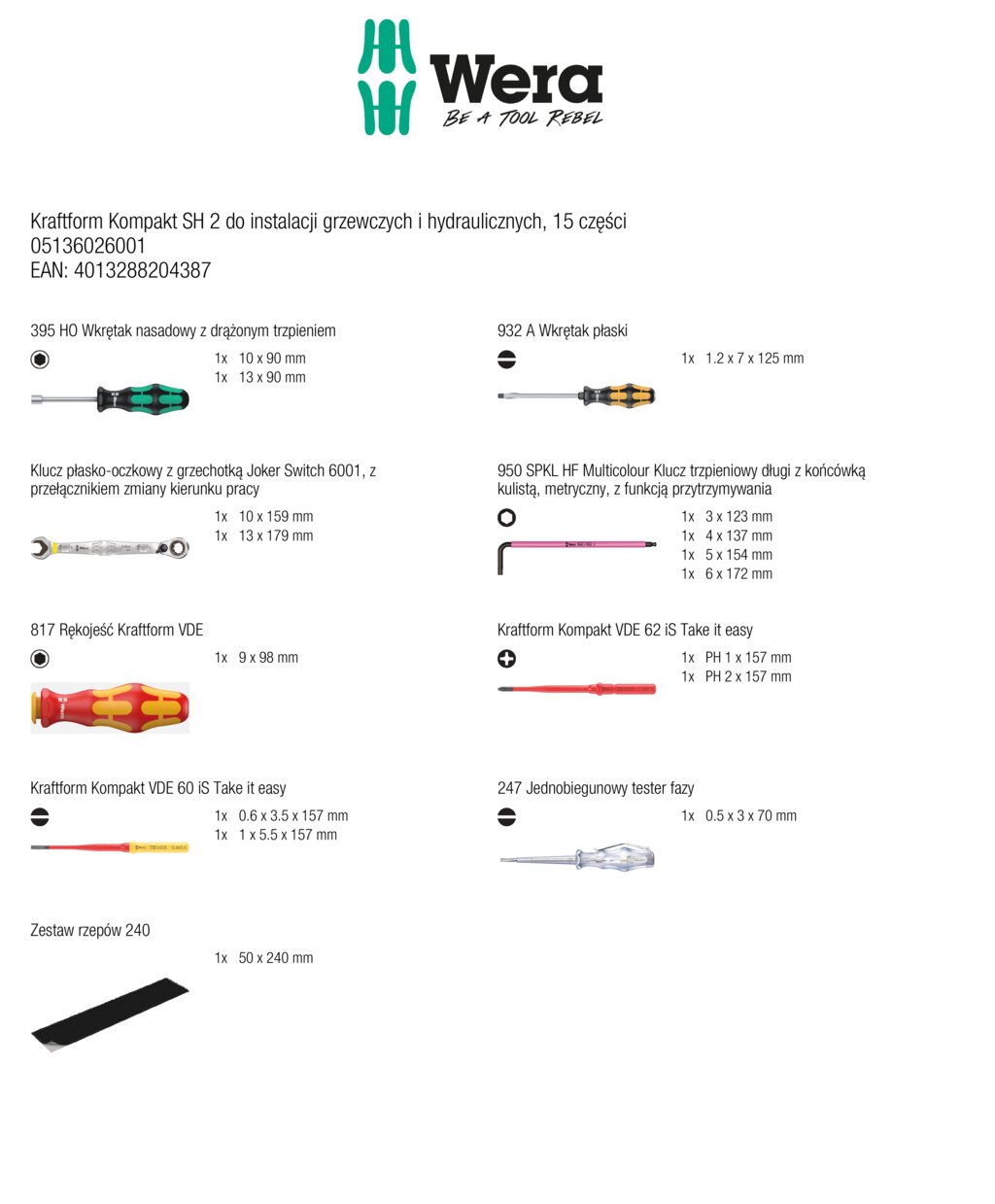 - Dwa płasko-oczkowe odchylone klucze Joker z grzechotką ze specjalną płytką zabezpieczającą przed ześlizgnięciem lub zgubieniem śruby i zapewniającą zwiększenie przenoszonej siły; 1 uchwyt VDE i 4 trzpienie VDE iS do bezpiecznej pracy pod napięciem do 1000 V (trzpienie iS ze zredukowaną średnicą i zintegrowaną izolacją ochronną umożliwiającą dotarcie do nisko położonych elementów śrubowych i sprężynowych); 1 próbnik napięcia 247; 4 klucze kątowe z profilem Hex-Plus zapobiegającym przekręceniu śruby; 1 wkrętak do pobijania Kraftform 932 A (do wkrętów z rowkiem) z przelotowym trzpieniem 6-kątnym i wbudowaną nasadką do pobijania przeznaczoną do wkręcania i lekkich prac związanych z kuciem; 2 wkrętaki nasadowe z grotem rurkowym 395 HO do dokręcania lub odkręcania nakrętek na długich wkrętach jak również do wykręcania zapieczonych śrub.