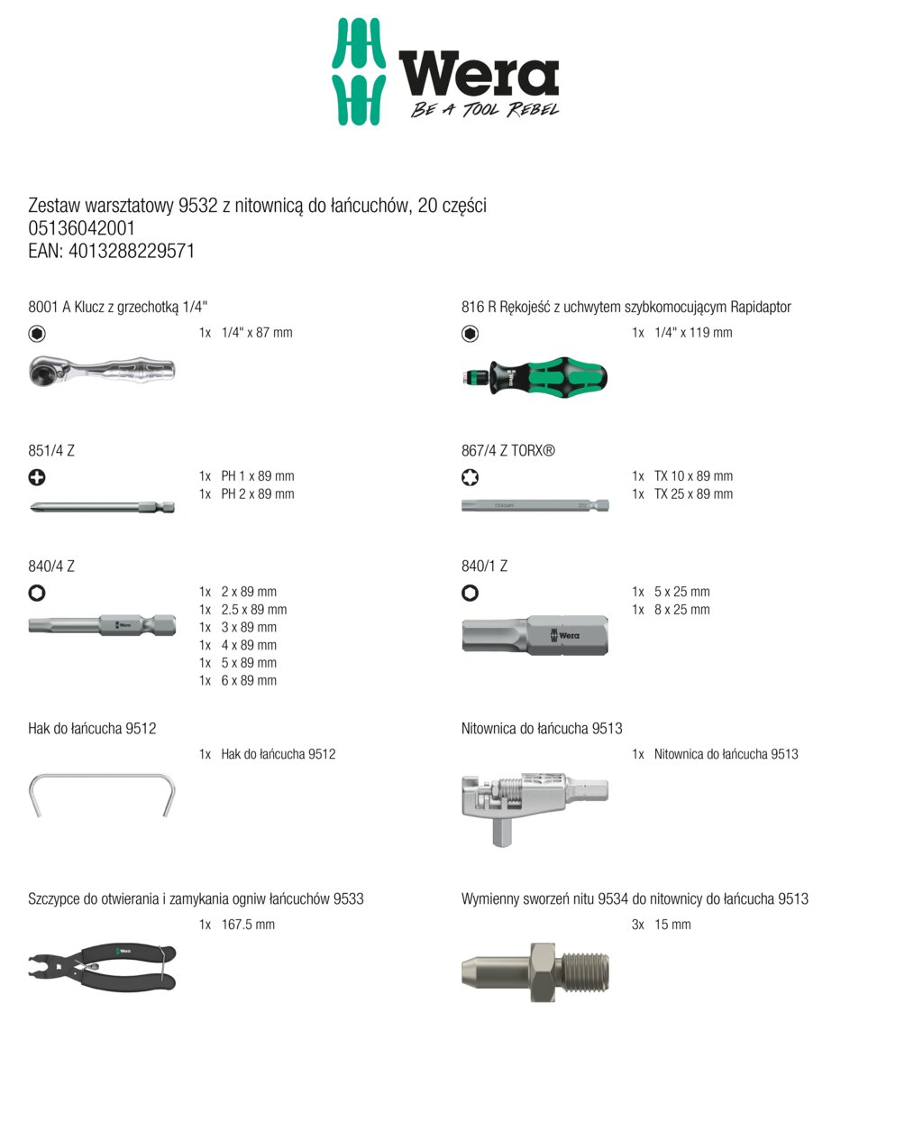 - Z grzechotką do bitów Wera Zyklop Mini 1, rękojeścią z uchwytem do bitów 816 R, 1 nitownicą do łańcucha, 1 hakiem do łańcucha, zestawem części zamiennych do nitownicy do łańcucha, 1 szczypcami do zamykania i otwierania ogniw łańcucha, 10 bitami o długości 89 mm, 2 bitami o długości 25 mm
