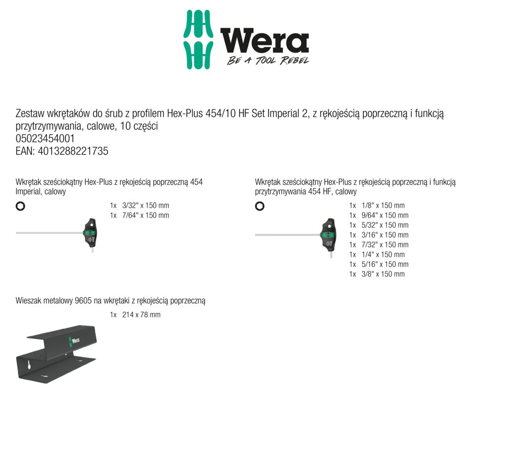 Zestaw wkrętaków śrubokrętów do śrub z profilem Hex-Plus 454/10 HF Set Imperial 2, z rękojeścią poprzeczną i funkcją przytrzymywania, calowe, 10 część 05023454001